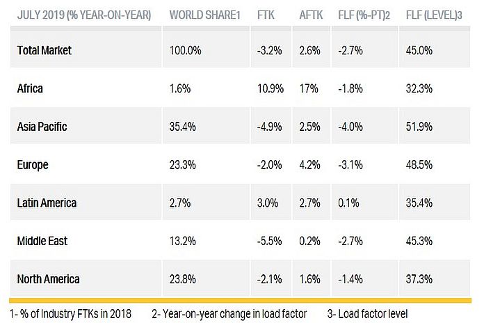 GENEVA, Switzerland – The International Air Transport Association (IATA) released data for global air freight markets showing that demand, measured in freight tonne kilometers (FTKs), contracted by 3.2 percent in July 2019, compared to the same period in 2018. This marks the ninth consecutive month of year-on-year decline in freight volumes.