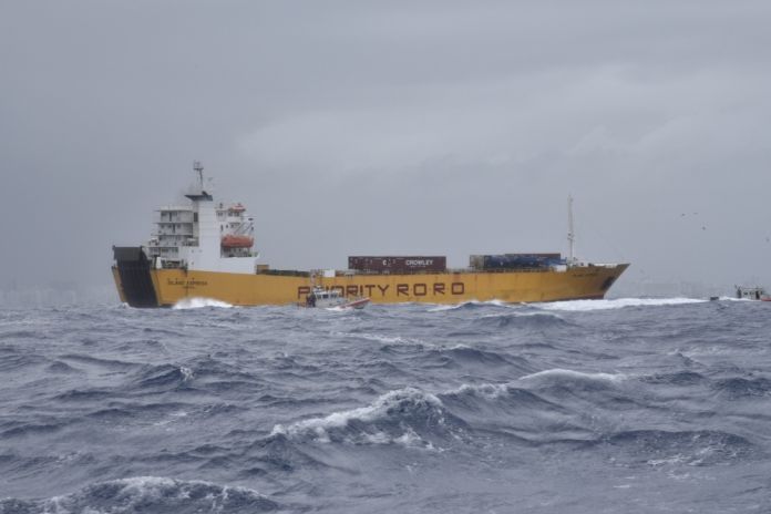 The M/V Island Express, a Cyprus flagged 412-foot ro-ro cargo ship, and its 18-man crew is now safely moored in San Juan Harbor.