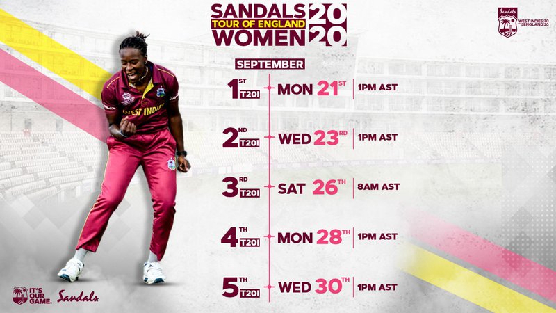 All of the matches will start at 6 pm British Summer Time (BST), 1pm Atlantic Standard Time (AST) or 12 pm Eastern Standard Time (EST), except for the 3rd T20I on September 26 starting at 1 pm BST 8 am AST, 7 am (EST).